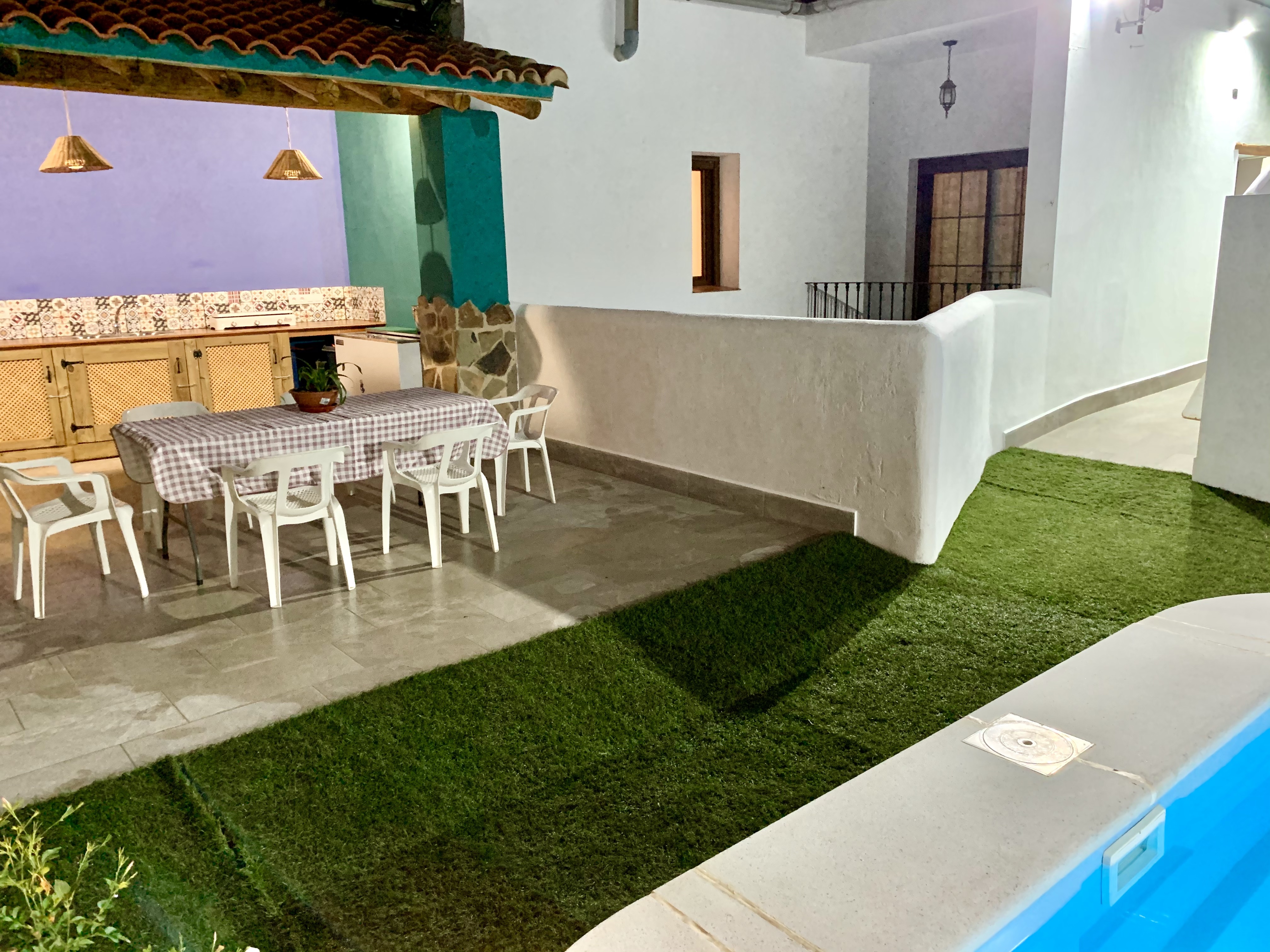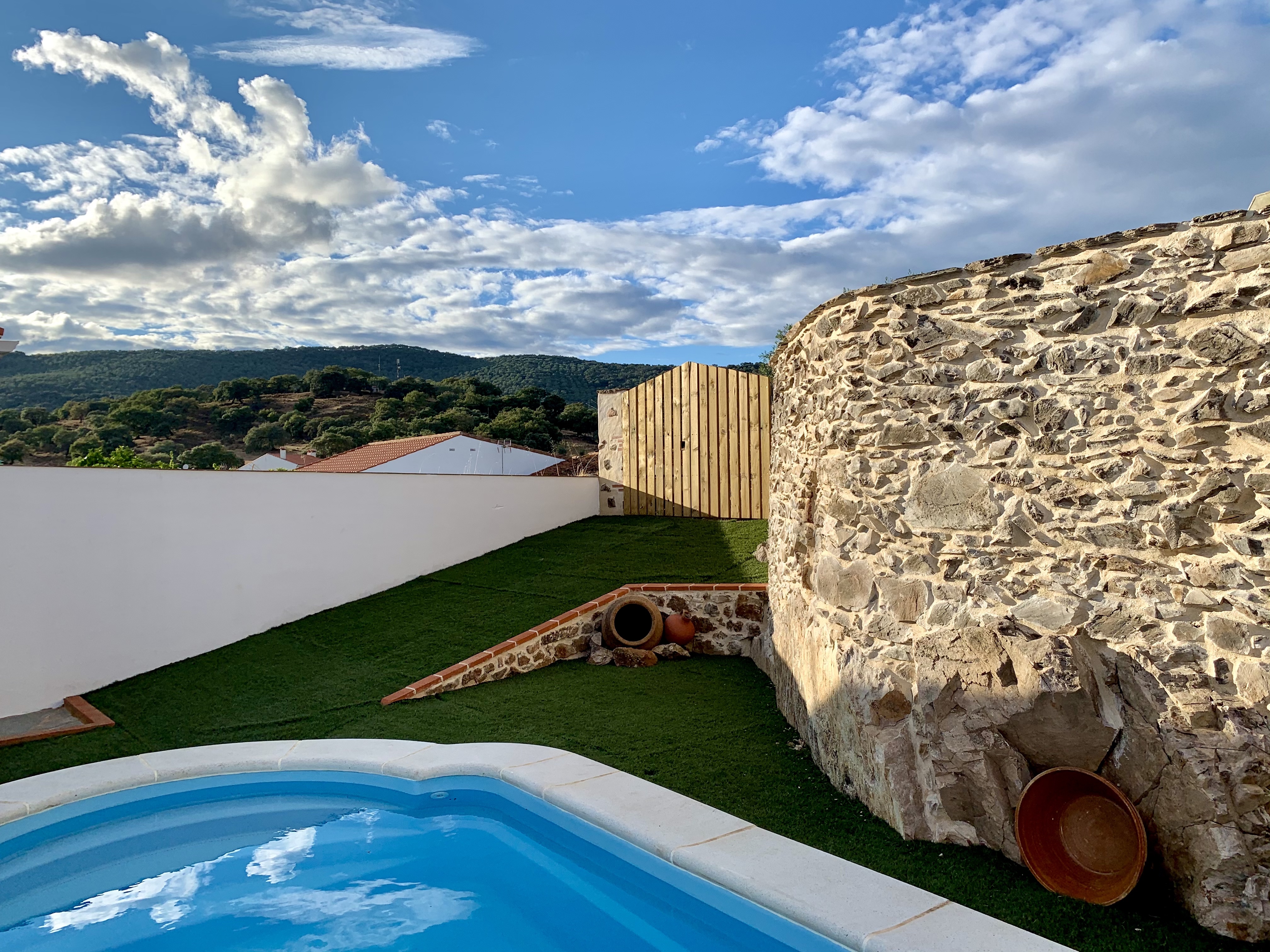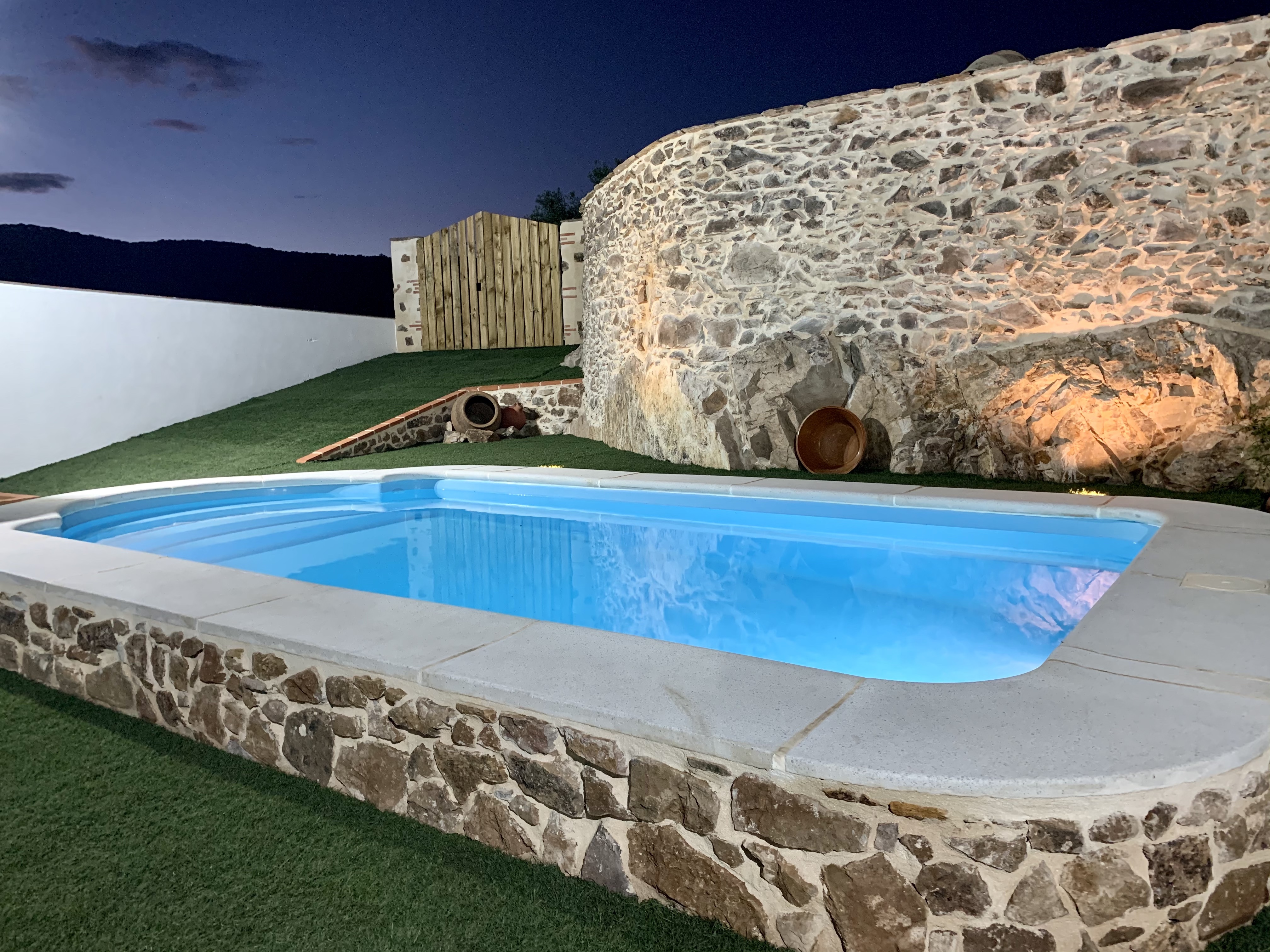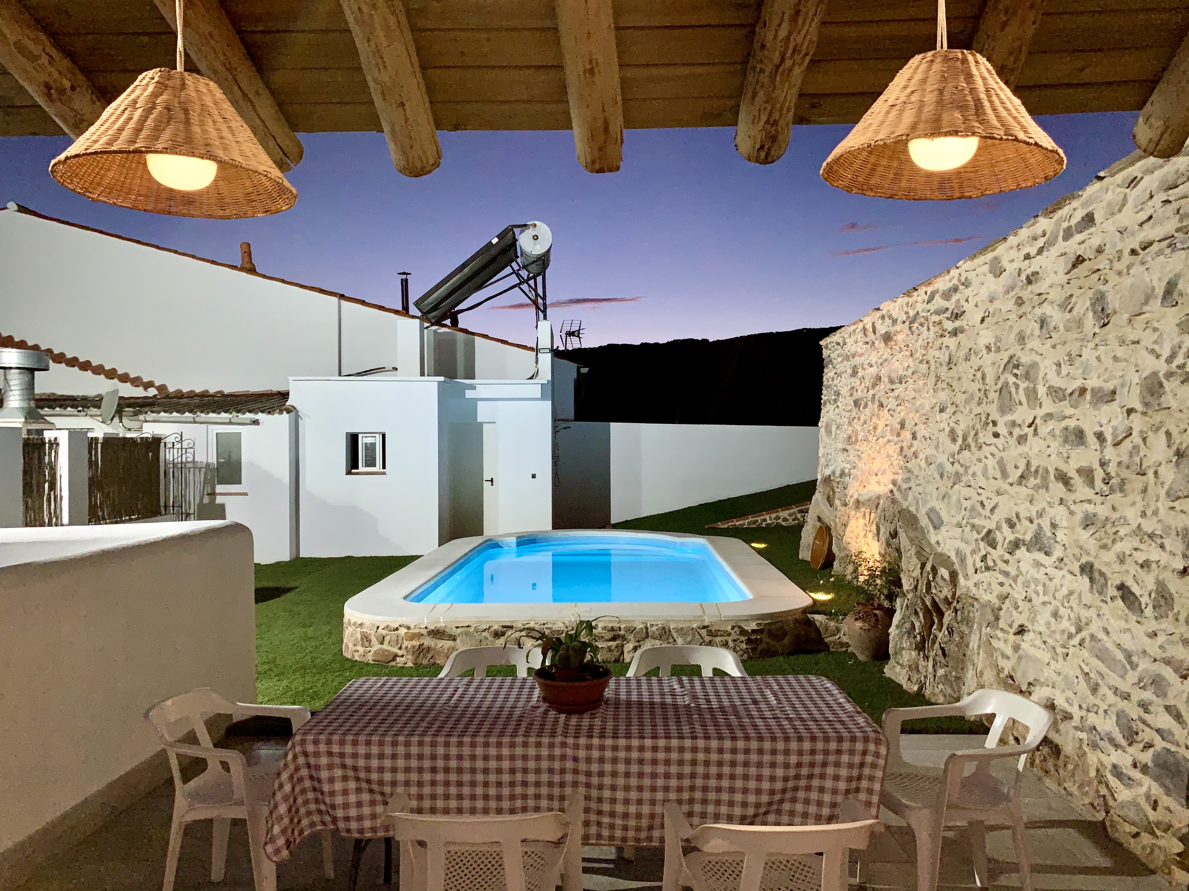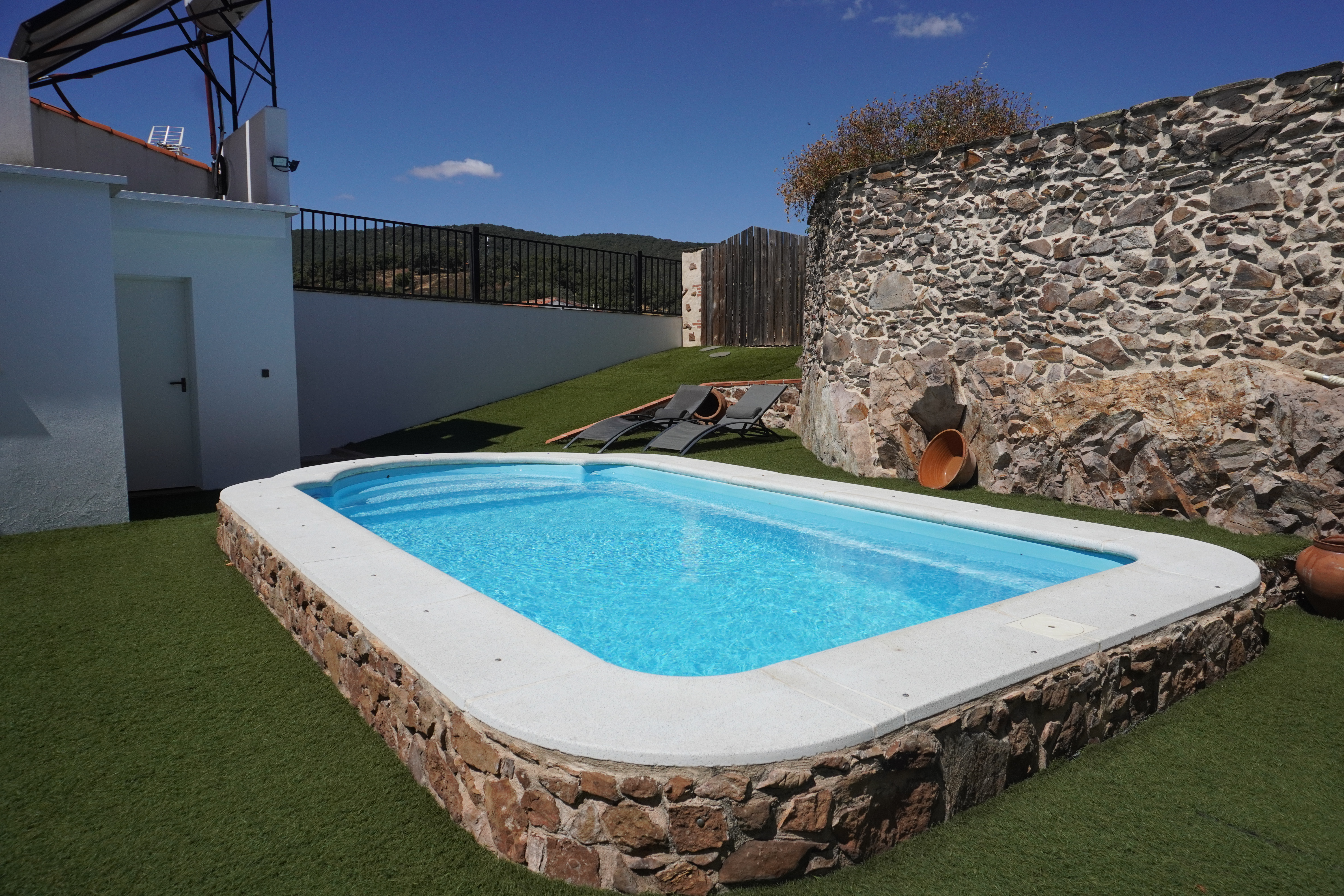 - Piscina y zona de barbacoa: espacio de 300 metros cuadrados con piscina privada y cocina exterior con barbacoa. Nos encontramos ante una idílica estancia al aire libre donde podrás disfrutar de un relajante baño durante el verano y bonitas puestas de sol mirando a la sierra. Por la noche la piscina se convierte en un fantástico espacio íntimo donde podrás divertirte y observar el cielo estrellado de Hinojales. La cocina exterior es un lugar alegre y tranquilo equipada con todo lo necesario para saborear una buena comida entre amigos.
