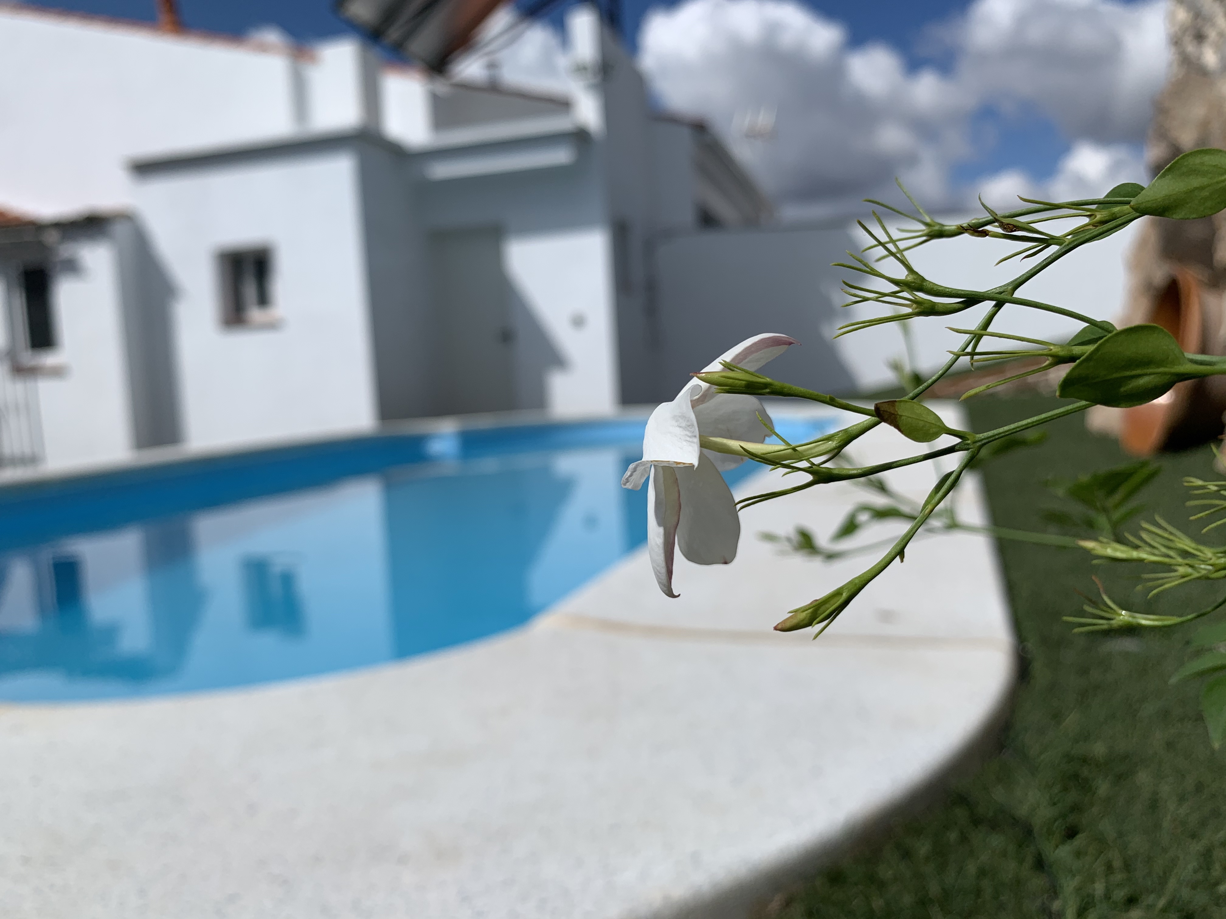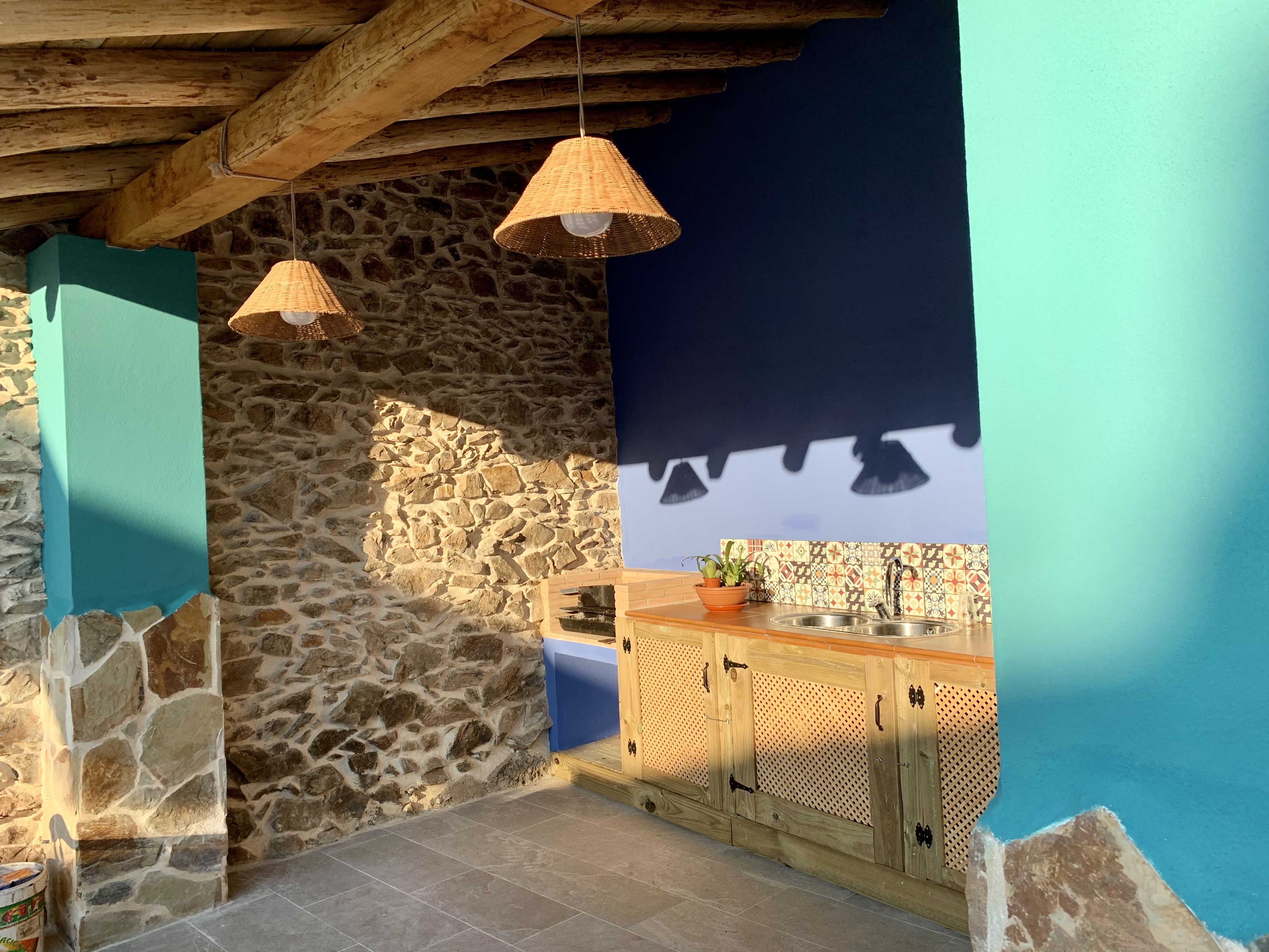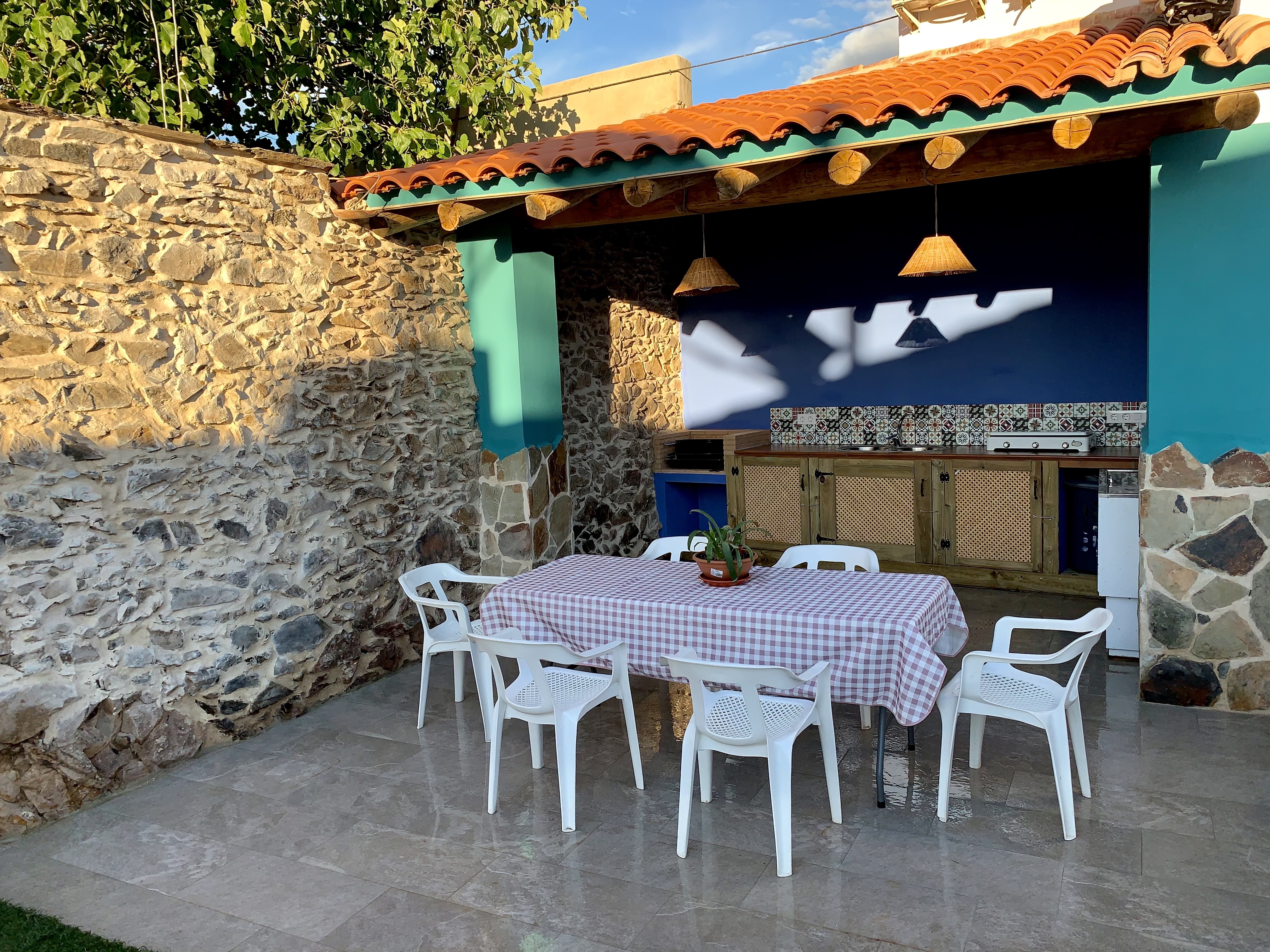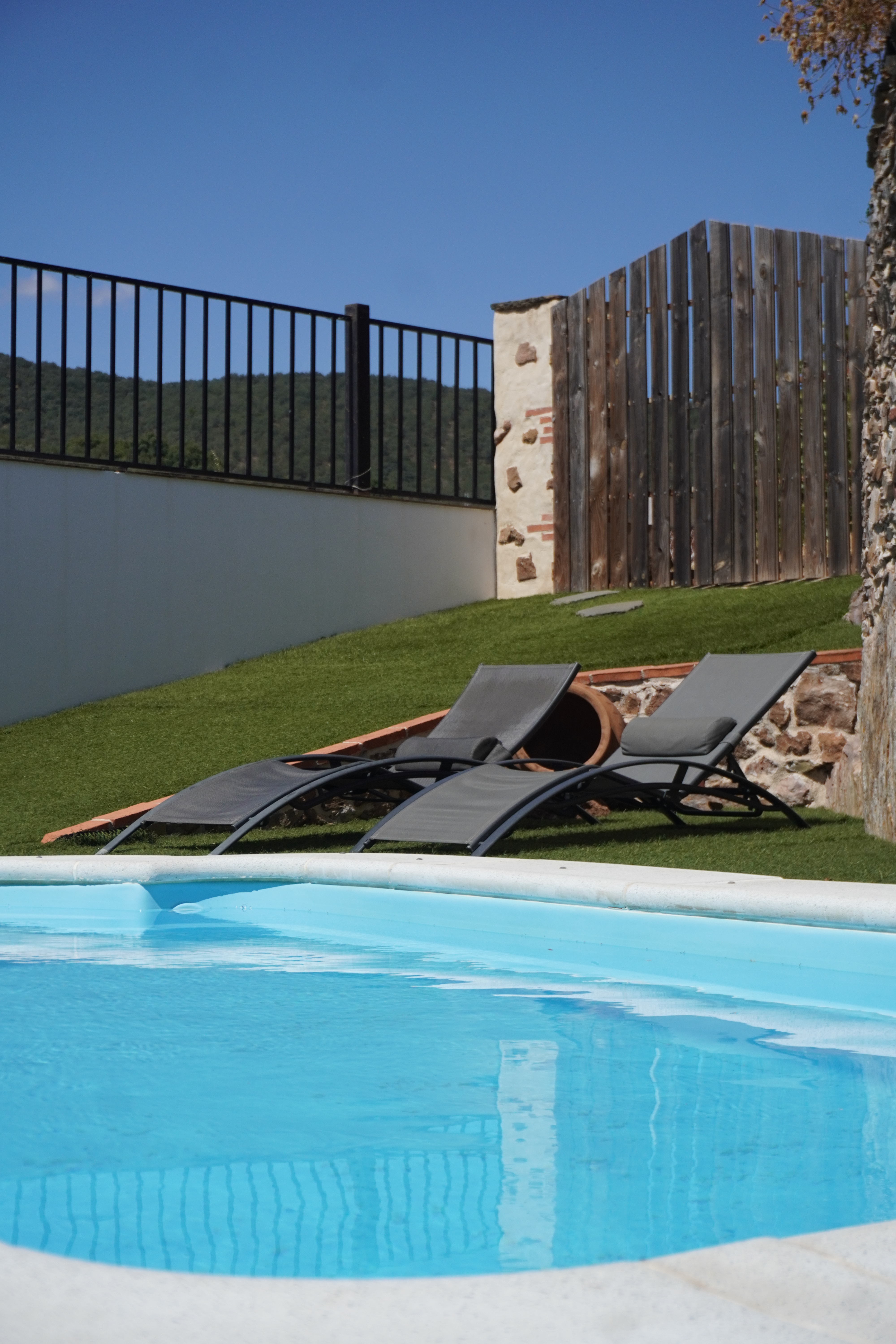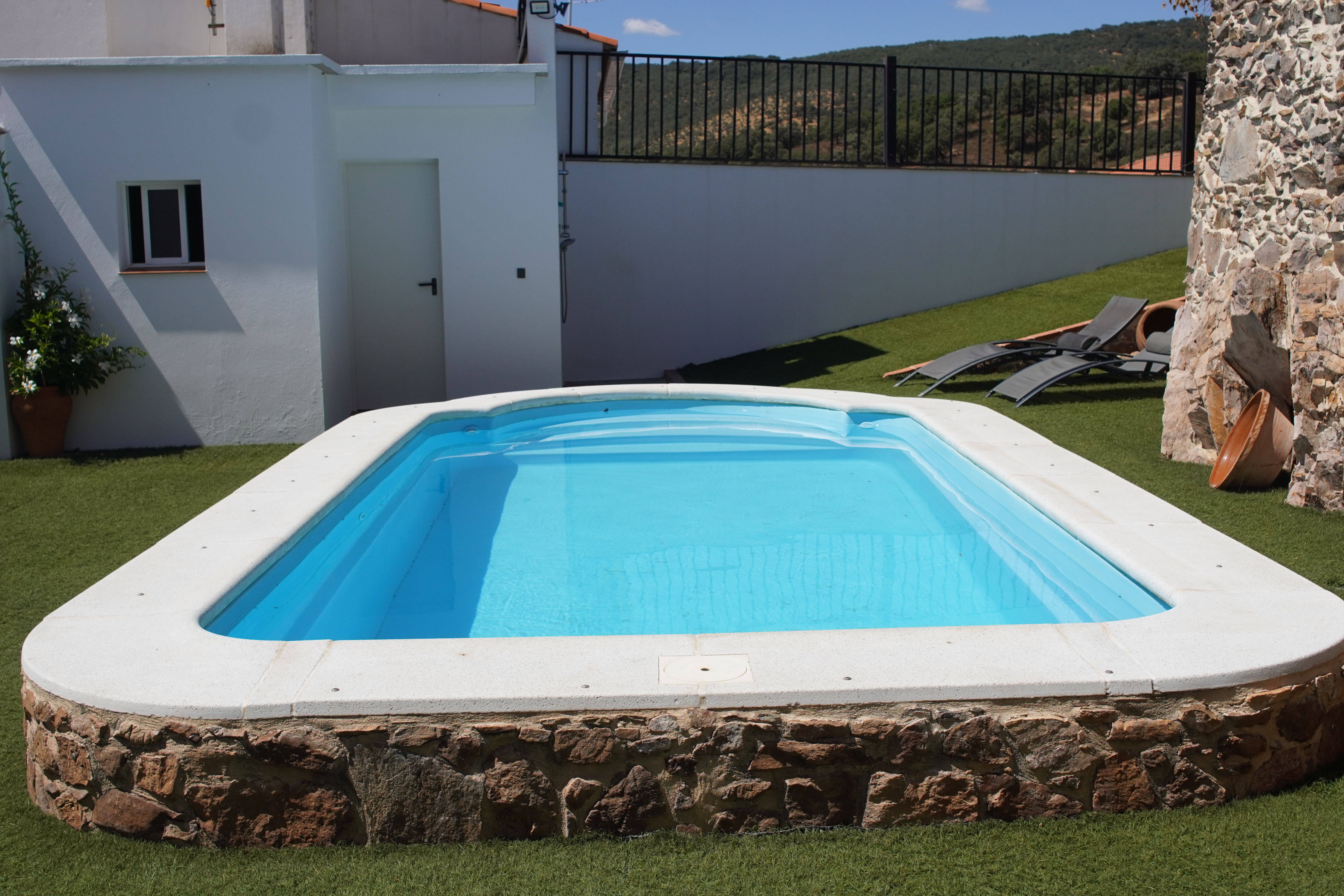 - Piscina y zona de barbacoa: espacio de 300 metros cuadrados con piscina privada y cocina exterior con barbacoa. Nos encontramos ante una idílica estancia al aire libre donde podrás disfrutar de un relajante baño durante el verano y bonitas puestas de sol mirando a la sierra. Por la noche la piscina se convierte en un fantástico espacio íntimo donde podrás divertirte y observar el cielo estrellado de Hinojales. La cocina exterior es un lugar alegre y tranquilo equipada con todo lo necesario para saborear una buena comida entre amigos.