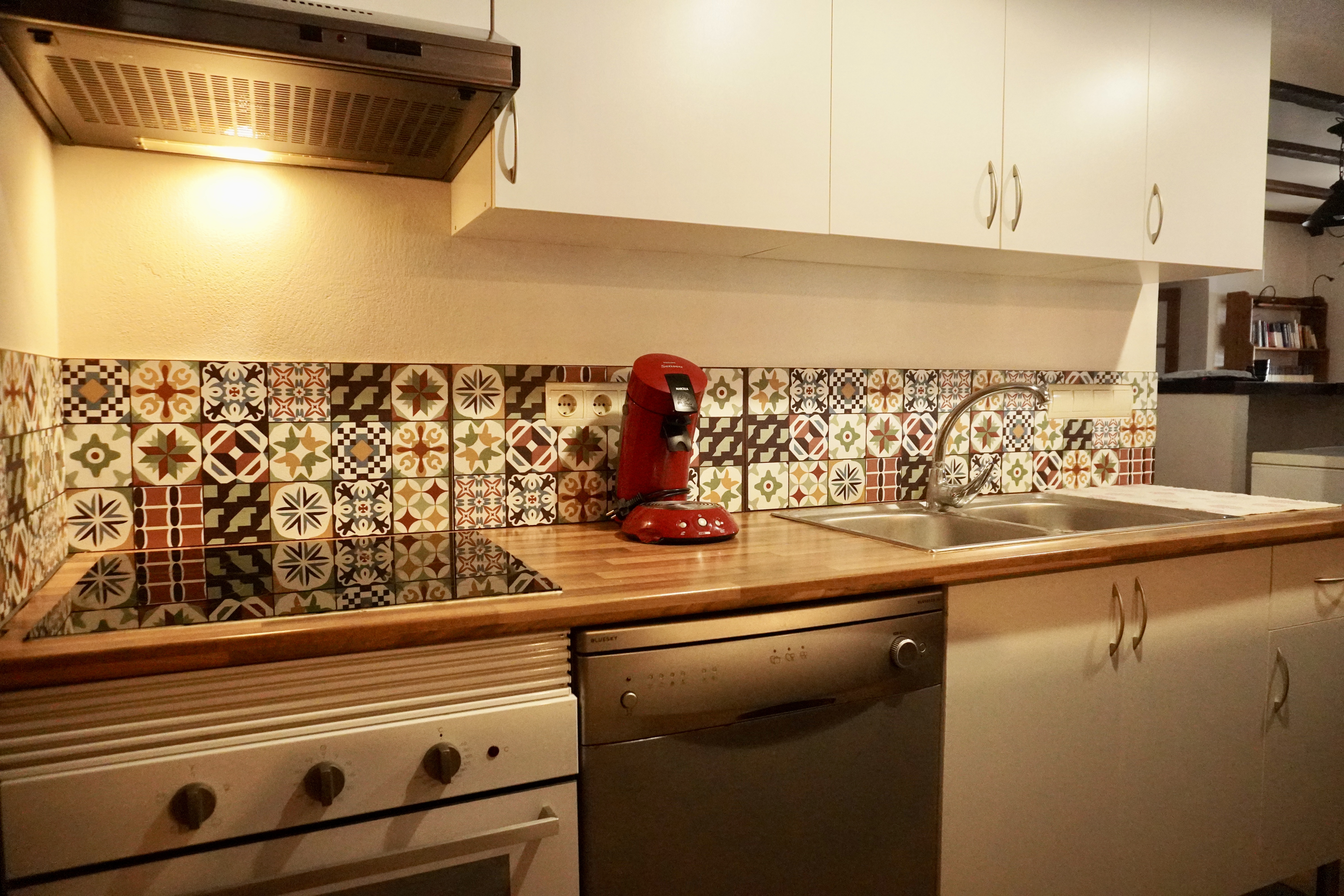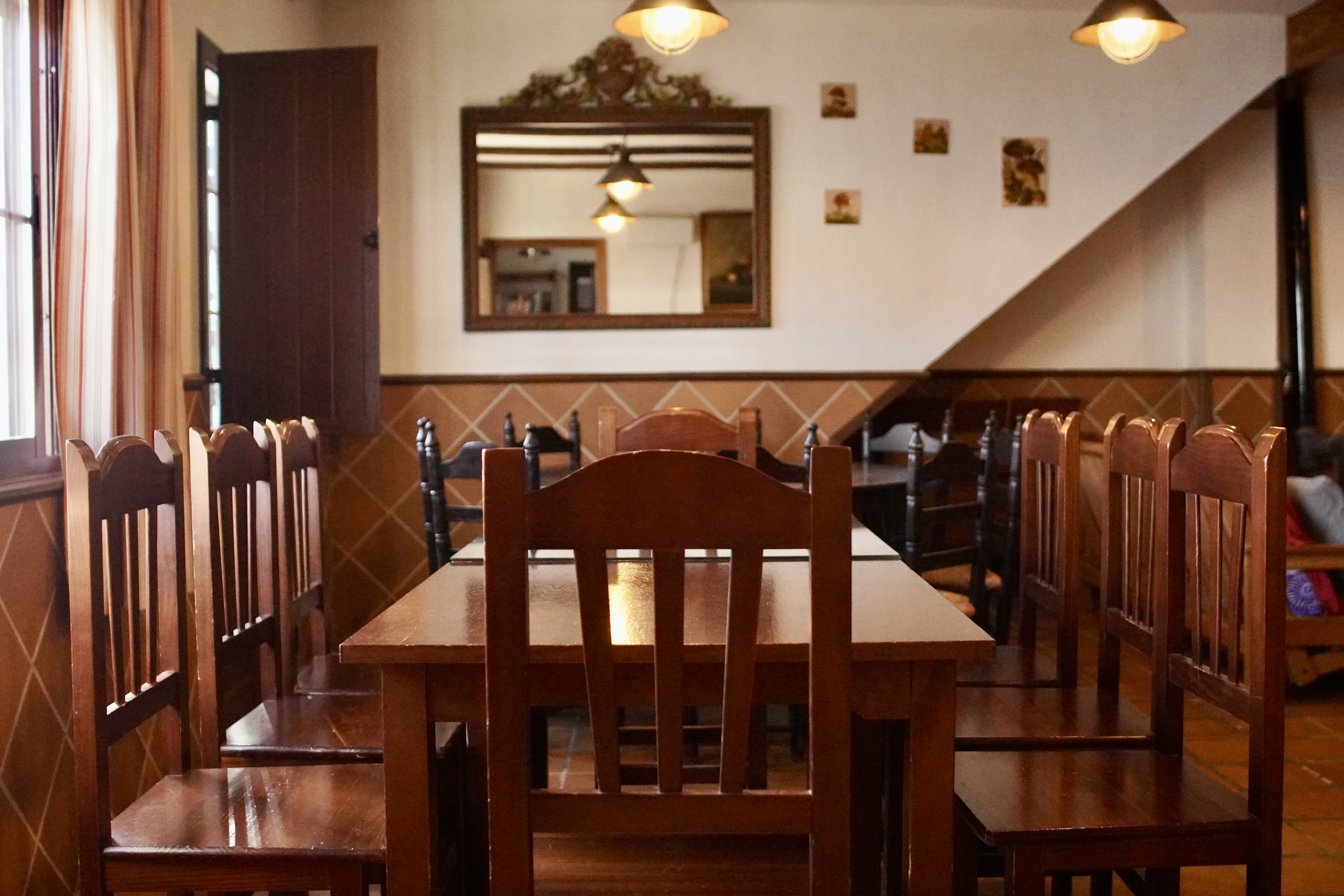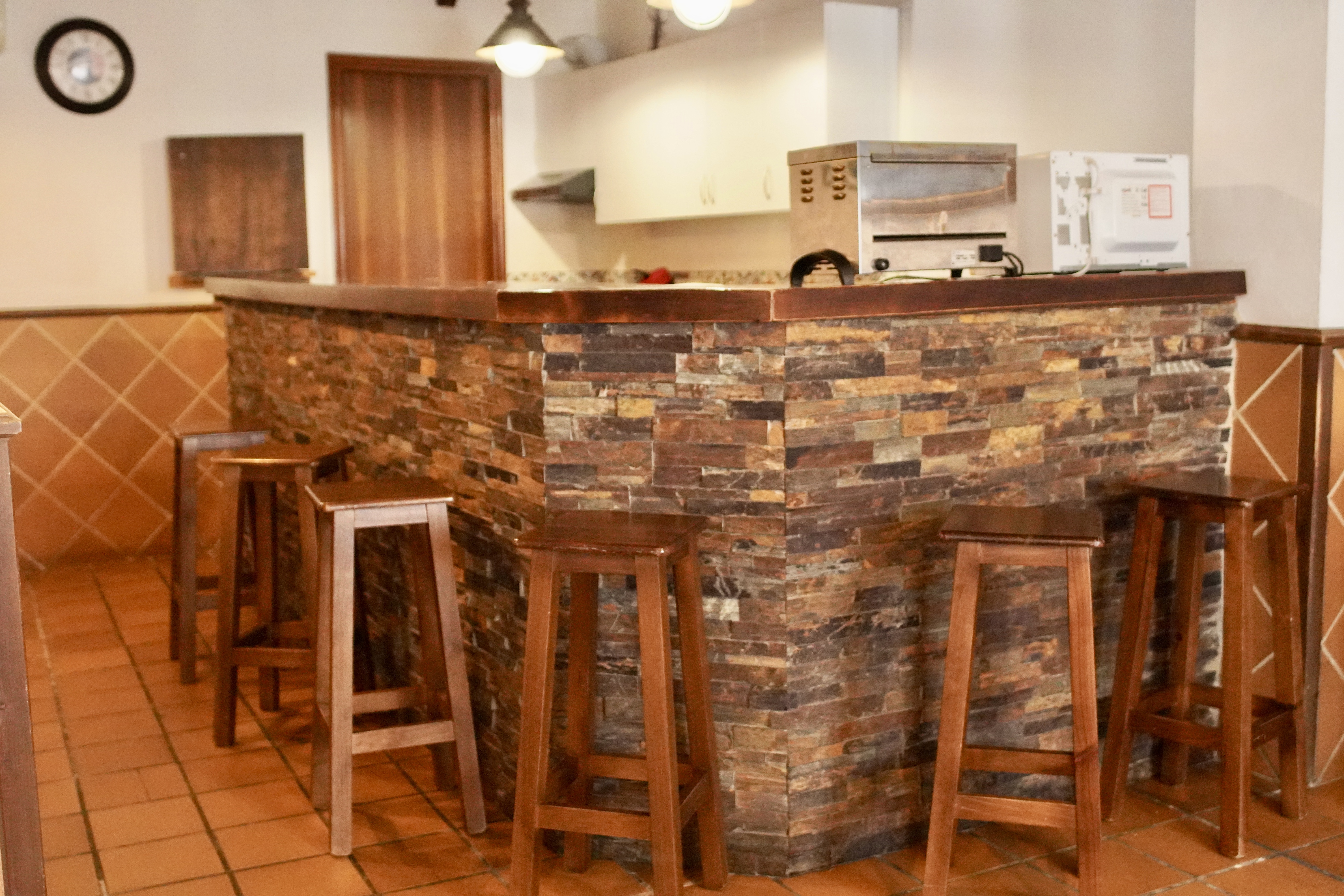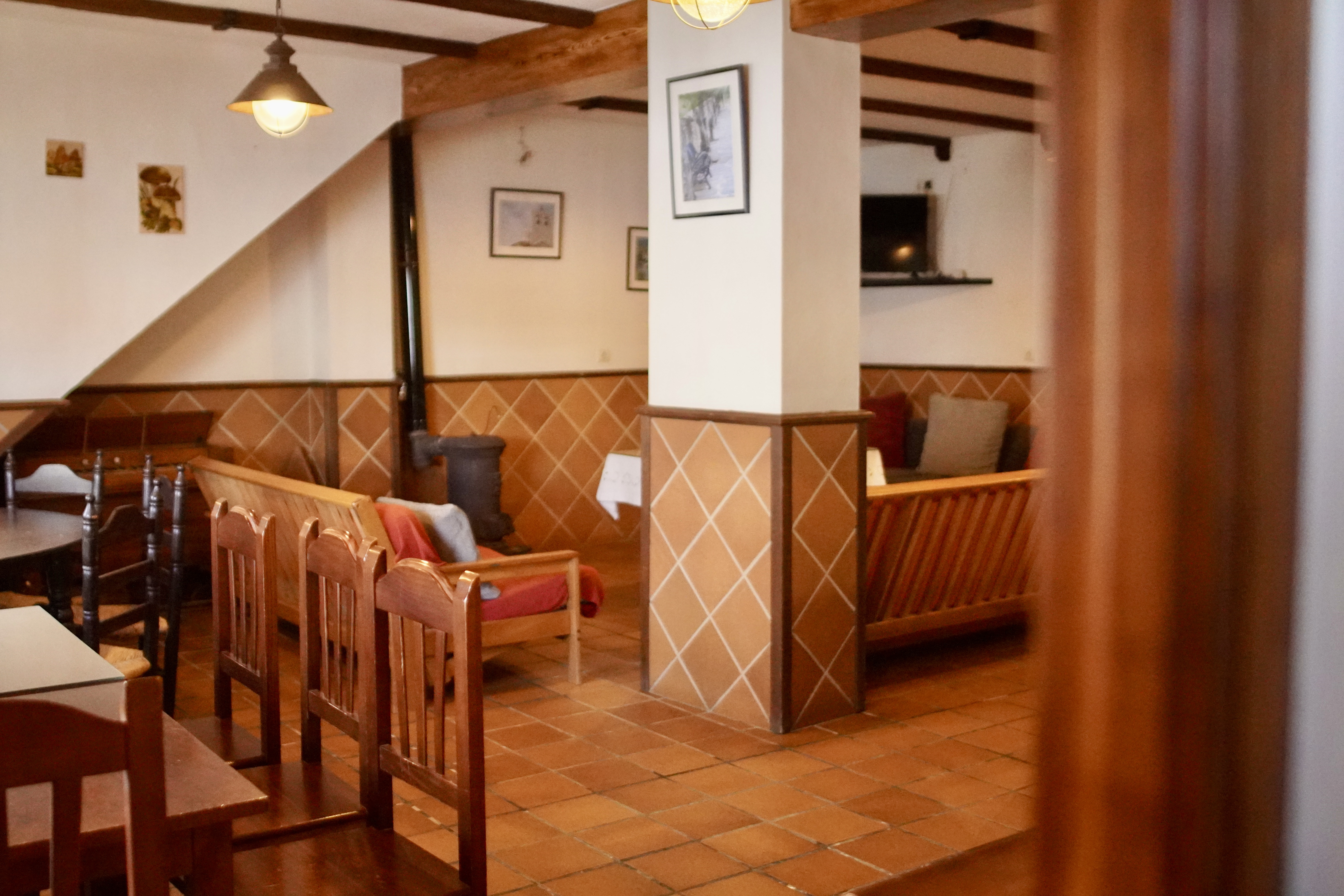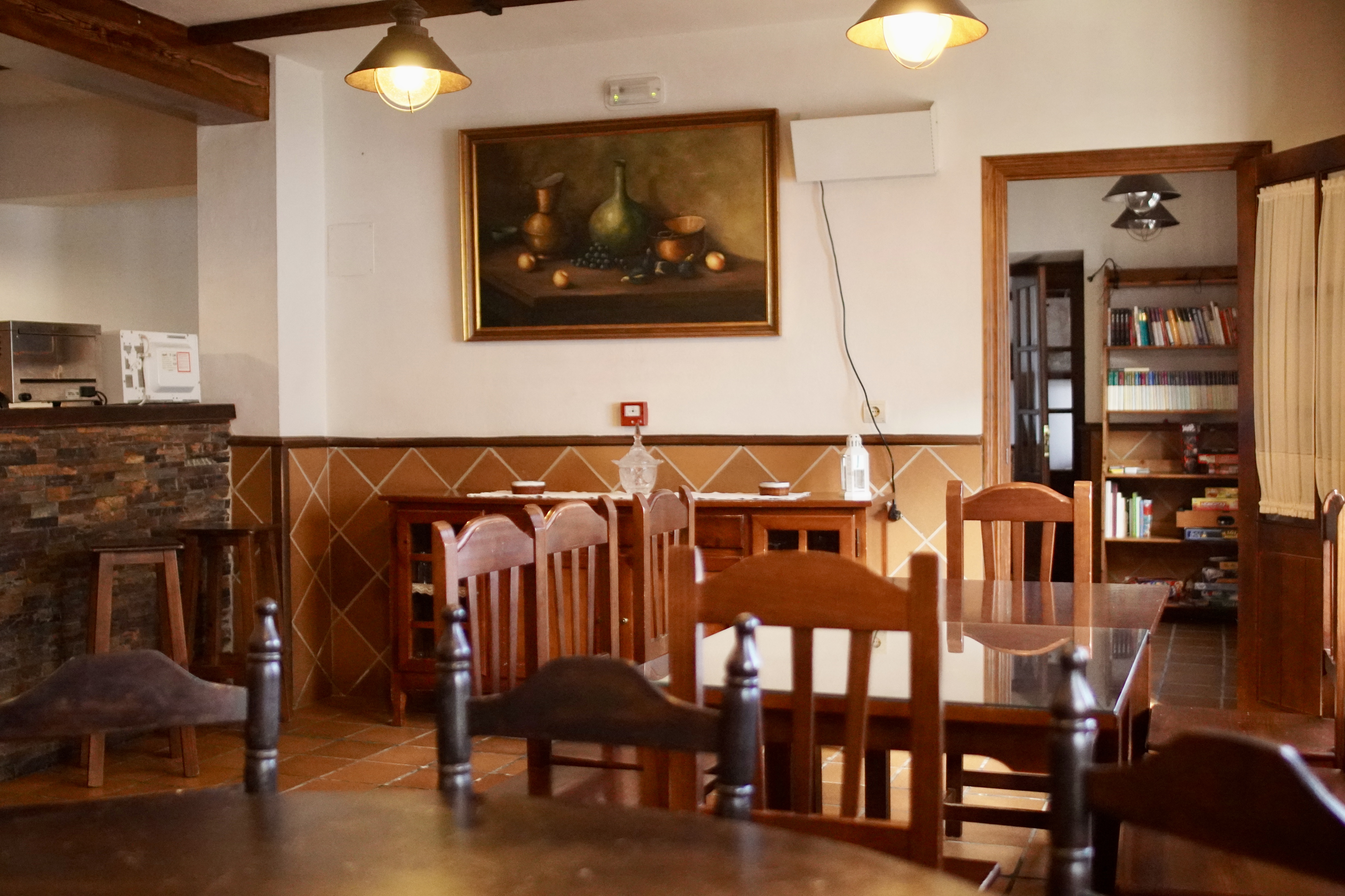 - Salón, cocina y comedor: en invierno el corazón de la casa es su gran salón, un espacio abierto y separado de las habitaciones con estufa de leña, perfecto para pasar momentos inolvidables en familia o con amigos. Dispone de una acogedora zona con sofás y TV de 50 pulgadas, a la vez que una pequeña biblioteca y divertidos juegos de mesa. También tiene otra zona habilitada para comedor, con mesas y sillas de enea y dos sillones altos para los niños. La cocina está separada del salón-comedor por una rústica y bonita barra de bar. Es una coqueta cocina equipada con horno, microondas, placa de inducción, lavadora, cámara frigorífica, congelador y todos los utensilios de cocina necesarios para cocinar.